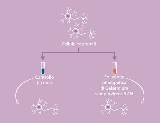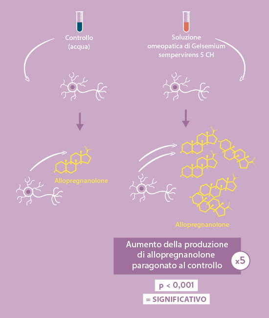 Le cellule trattate con una soluzione omeopatica di Gelsemium sempervirens 5 CH producono 5 volte più allopregnanolone delle cellule trattate con acqua.1.