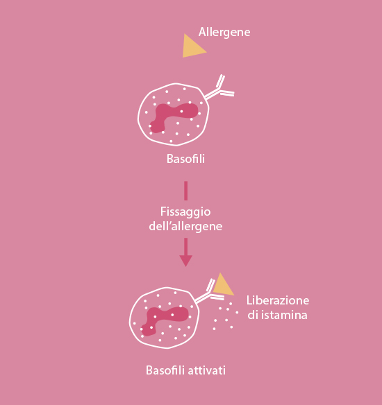 Durante una reazione allergica, vengono attivate delle cellule immunitarie del corpo umano, dette basofili, che liberano dell’istamina. L’istamina è una molecola responsabile delle manifestazioni cliniche allergiche.