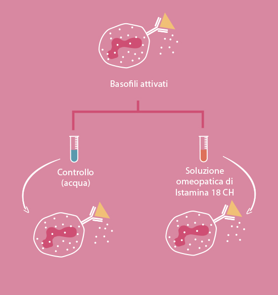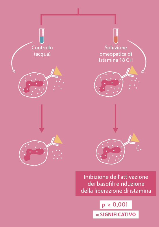 L’attivazione dei basofili è inibita nel gruppo trattato con la soluzione omeopatica rispetto al gruppo trattato con acqua. Questa inibizione comporta una riduzione della liberazione di istamina e, di conseguenza, una diminuzione della reazione allergica.